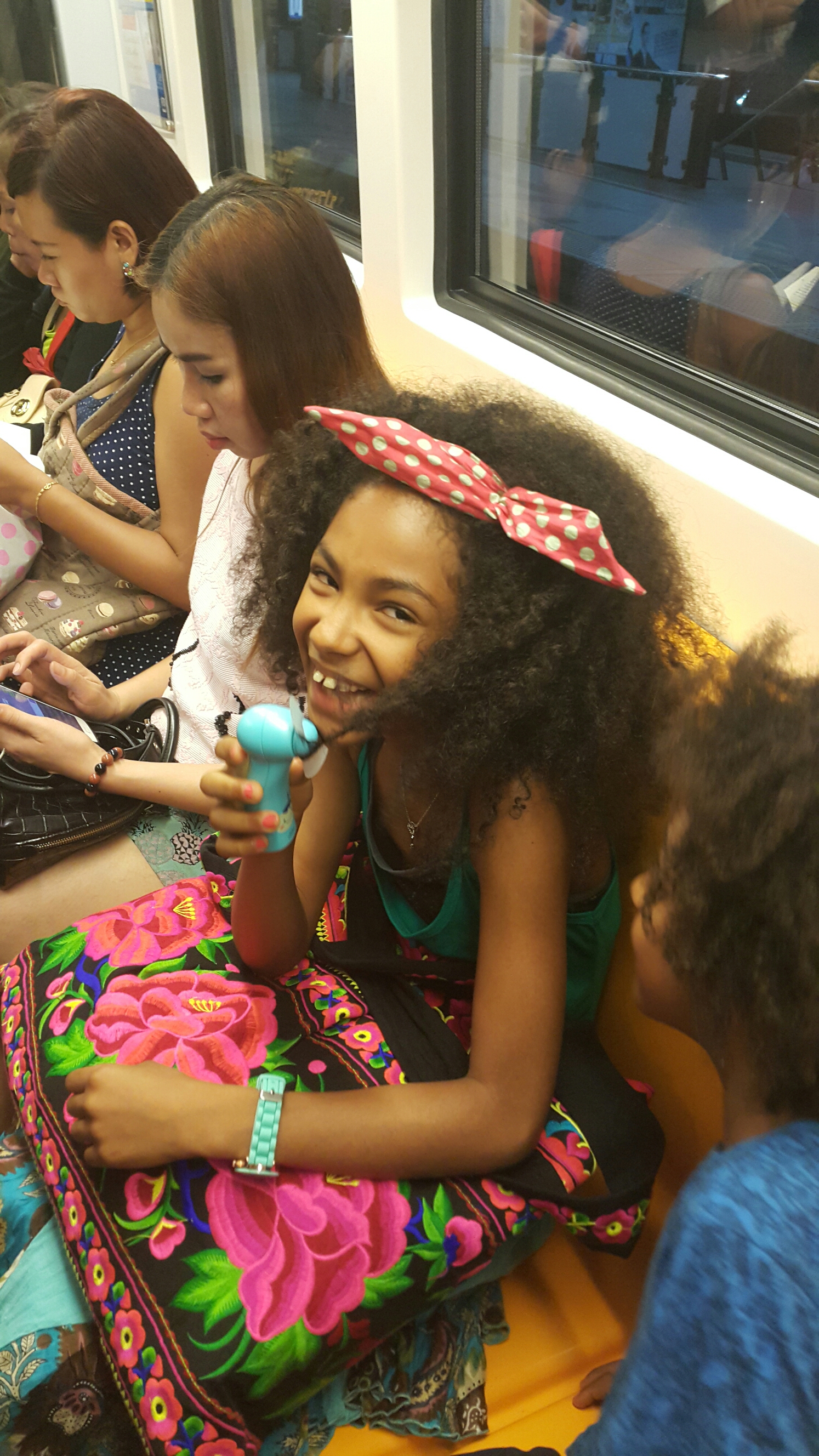 While on the train back home…my 5yr old boy had a play fan and he got it all caught up in his sisters hair…what a train ride.