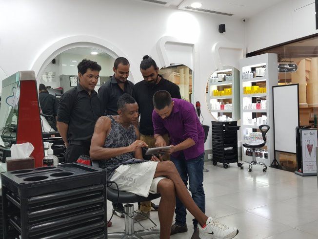 Hubby getting a hair cut requires a team effort