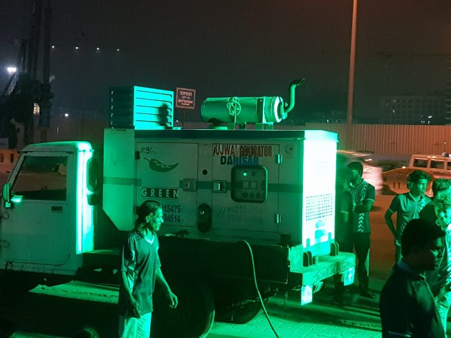 The generator at the back of the truck producing light that flashes on the god on another truck…